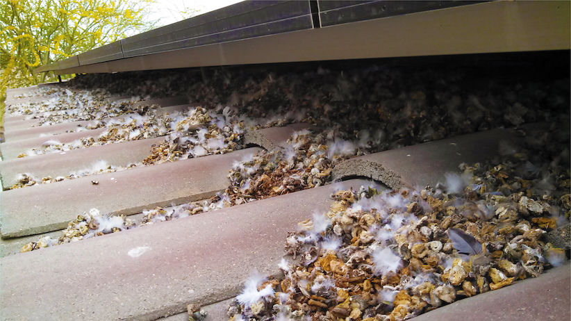 La forte presenza dei piccioni causa un grande accumulo di guano, di uova, penne e di piume. La conseguenza più evidente, oltre all’imbrattamento diffuso e ostinato, è un minore rendimento dell’impianto causato dall’acidità del guano che opacizza il vetro dei pannelli.